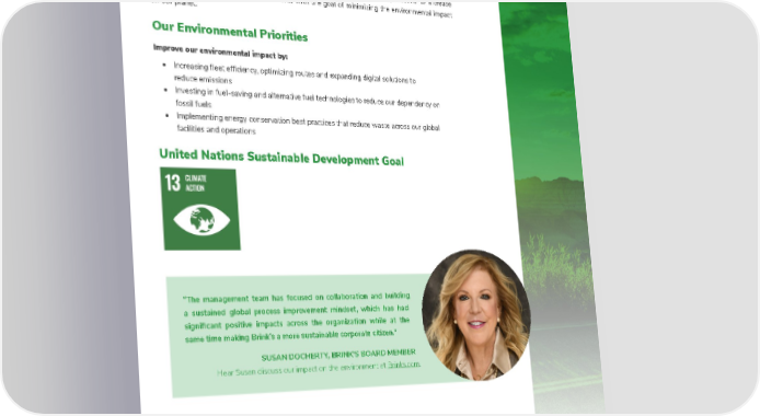 ENVIRONMENT: A FLEET OF POSSIBILITIES Brink’s is integrating responsible environmental practices into our daily operations to increase efficiency and reduce waste and emissions, with the goal of minimizing the environmental impact on our planet. Our Environmental Priorities Improve our environmental impact by: • Increasing fleet efficiency, optimizing routes and expanding digital solutions to reduce emissions • Investing in fuel-saving and alternative fuel technologies to reduce our dependency on fossil fuels • Implementing energy conservation best practices that reduce waste across our global facilities and operations United Nations Sustainable Development Goal “The management team has focused on collaboration and building a sustained global process improvement mindset, which has had significant positive impacts across the organization while at the same time making Brink’s a more sustainable corporate citizen.” SUSAN DOCHERTY, BRINK’S BOARD MEMBER Hear Susan discuss our impact on the environment at Brinks.com. SUSTAINABILITY UPDATE | 6