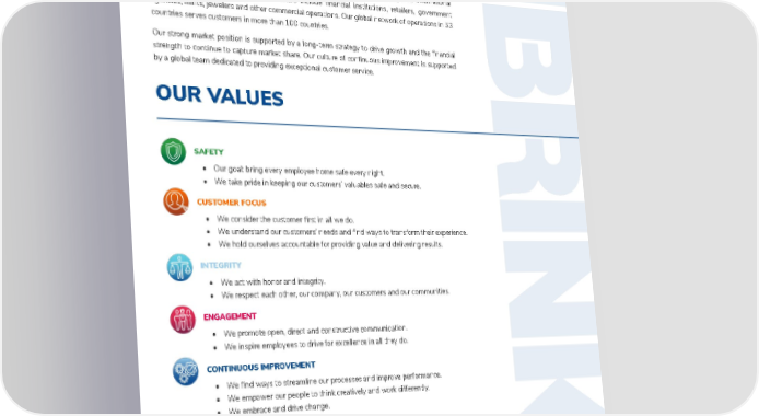 ABOUT BRINK’S The Brink’s Company (NYSE:BCO) is the global leader in total cash management, route-based secure logistics and payment solutions including cash-in-transit, ATM services, cash management services (including vault outsourcing, money processing and intelligent safe services) and international transportation of valuables. Our customers include financial institutions, retailers, government agencies, mints, jewelers and other commercial operations. Our global network of operations in 53 countries serves customers in more than 100 countries. Our strong market position is supported by a long-term strategy to drive growth and the financial strength to continue to capture market share. Our culture of continuous improvement is supported by a global team dedicated to providing exceptional customer service. OUR VALUES SAFETY • Our goal: bring every employee home safe every night. • We take pride in keeping our customers’ valuables safe and secure. CUSTOMER FOCUS • We consider the customer first in all we do. • We understand our customers’ needs and find ways to transform their experience. • We hold ourselves accountable for providing value and delivering results. INTEGRITY • We act with honor and integrity. • We respect each other, our company, our customers and our communities. ENGAGEMENT • We promote open, direct and constructive communication. • We inspire employees to drive for excellence in all they do. CONTINUOUS IMPROVEMENT • We find ways to streamline our processes and improve performance. • We empower our people to think creatively and work differently. • We embrace and drive change. DIVERSITY & INCLUSION • We foster an inclusive culture that values people with diverse backgrounds, ideas and perspectives. • We build a sense of belonging so all employees feel respected, safe and valued. • We provide equal opportunity to participate and grow. SUSTAINABILITY UPDATE | 5
