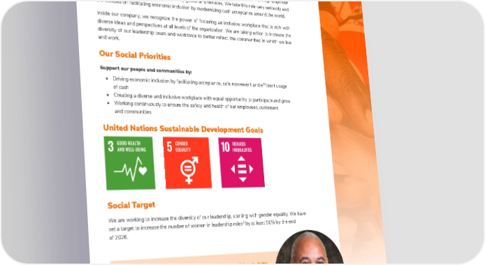 SOCIAL: ENVISIONING A BETTER WORLD Cash plays a critical role in society. By keeping cash moving and accessible, we help empower millions of consumers who rely on it to buy goods and services. We take this role very seriously and are focused on facilitating economic inclusion by modernizing cash acceptance around the world. Inside our company, we recognize the power of fostering an inclusive workplace that is rich with diverse ideas and perspectives at all levels of the organization. We are taking action to increase the diversity of our leadership team and workforce to better reflect the communities in which we live and work. Our Social Priorities Support our people and communities by: • Driving economic inclusion by facilitating acceptance, safe movement and efficient usage of cash • Creating a diverse and inclusive workplace with equal opportunity to participate and grow • Working continuously to ensure the safety and health of our employees, customers and communities United Nations Sustainable Development Goals Social Target We are working to increase the diversity of our leadership, starting with gender equality. We have set a target to increase the number of women in leadership roles1 by at least 50% by the end of 2026. “Businesses that don’t accept cash are actually practicing de facto discrimination against our most vulnerable community members, including the elderly and the poor, by excluding them from the purchase of basic necessities.” LOUIS PARKER, BRINK’S BOARD MEMBER Hear Louis discuss our social practices and programs at Brinks.com. 1 Defined as salary grade 18 and above SUSTAINABILITY UPDATE | 7